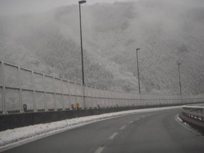 木曽街道へ入るとそらは暗くなり雪が降り始めました。